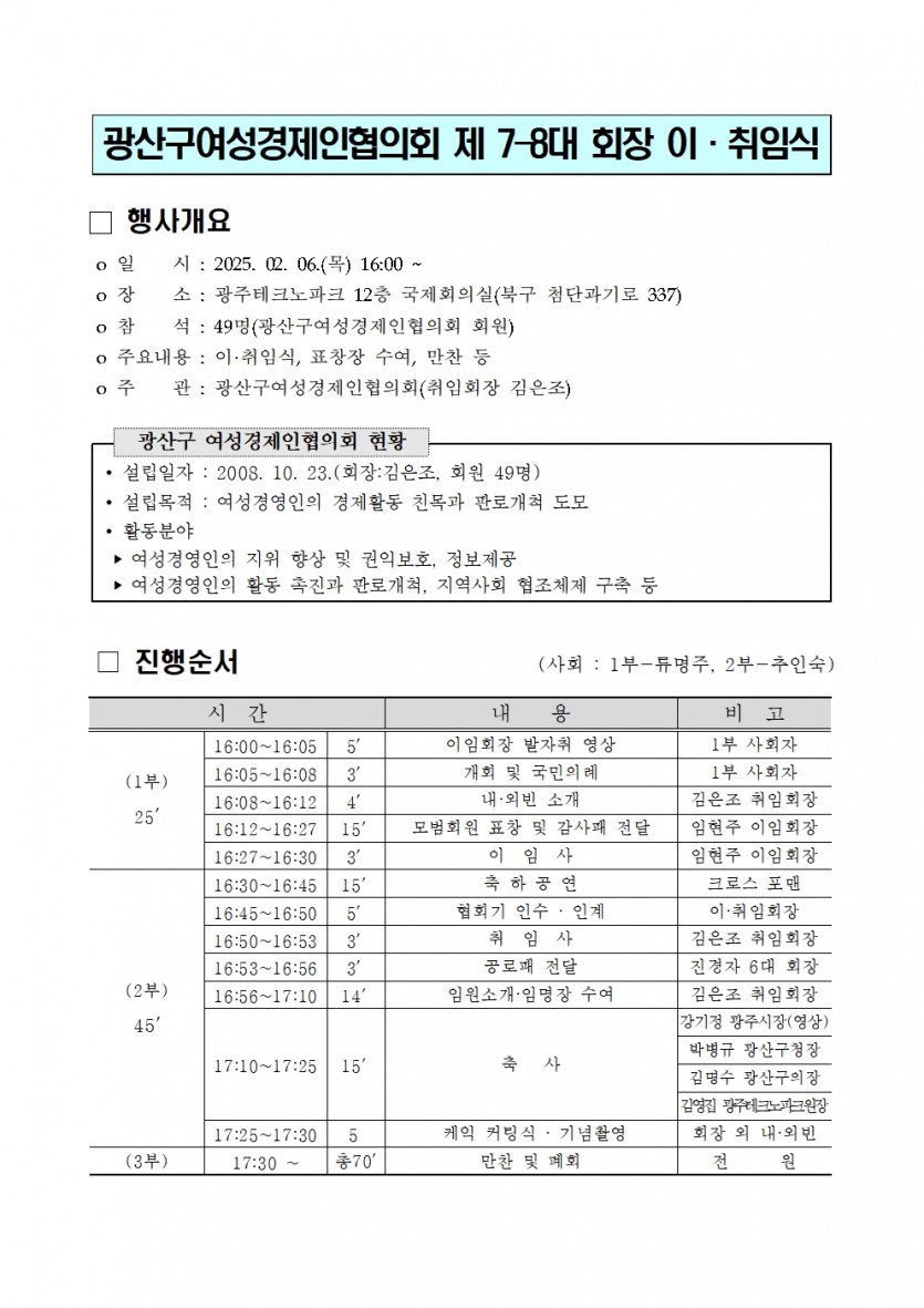 광산구여성경제인협의회 제 7-8대 회장 이.취임식 페이지 정보 작성자 관리자 작성일 25-02-02 16:40 댓글 0 조회 367 본문 일 시: 2025년 02.06(목)16:00~ 장 소: 광주테크노파크 12층 국제회의실 (북구 첨단과기로 337) 목록보기
